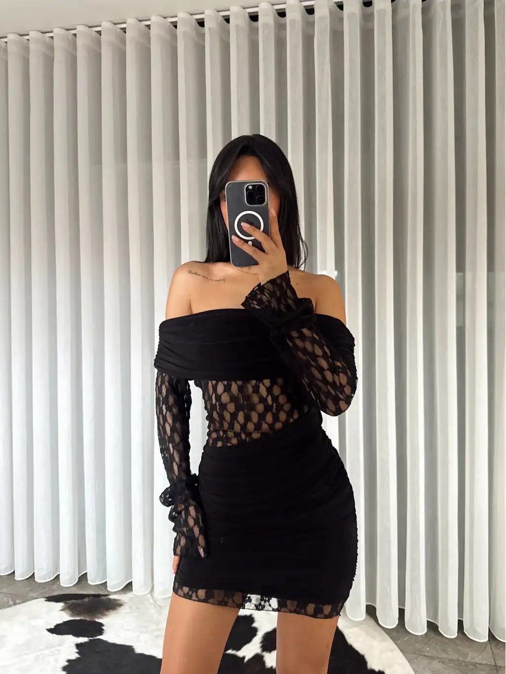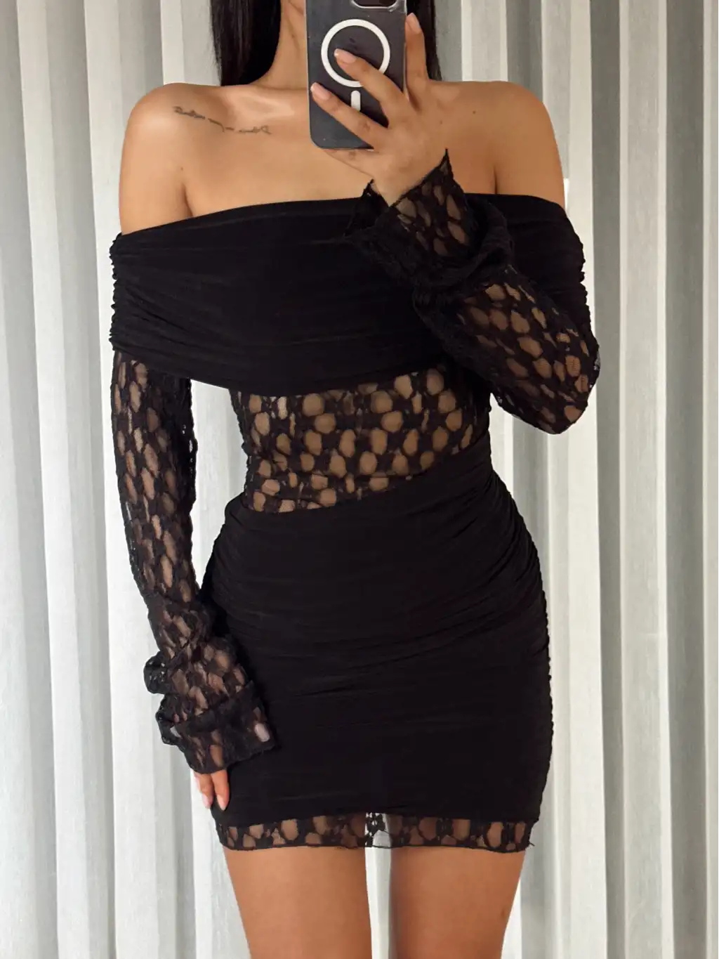 Açık omuz dantel detay elbise - Siyah