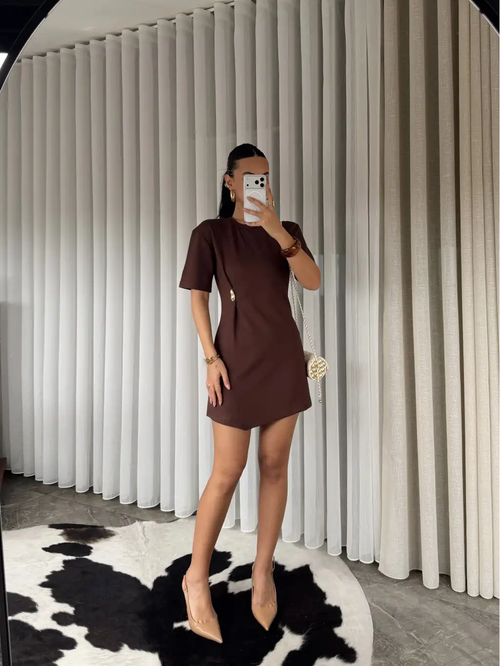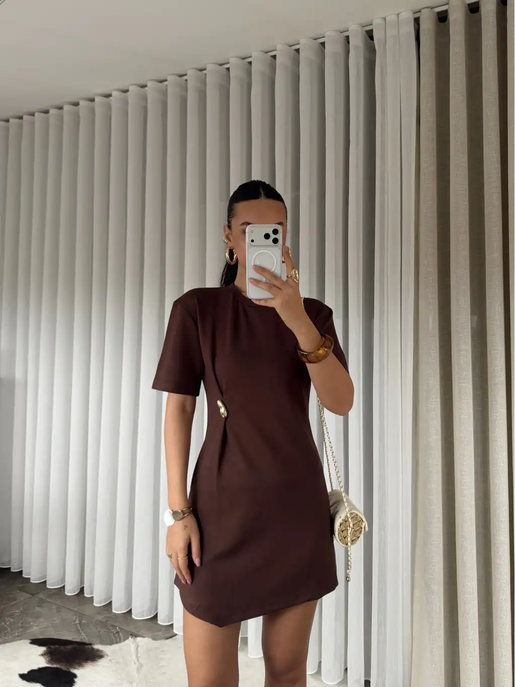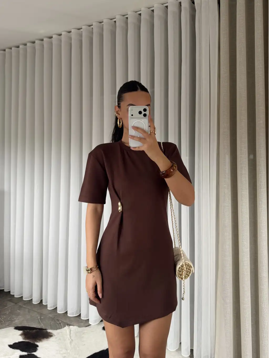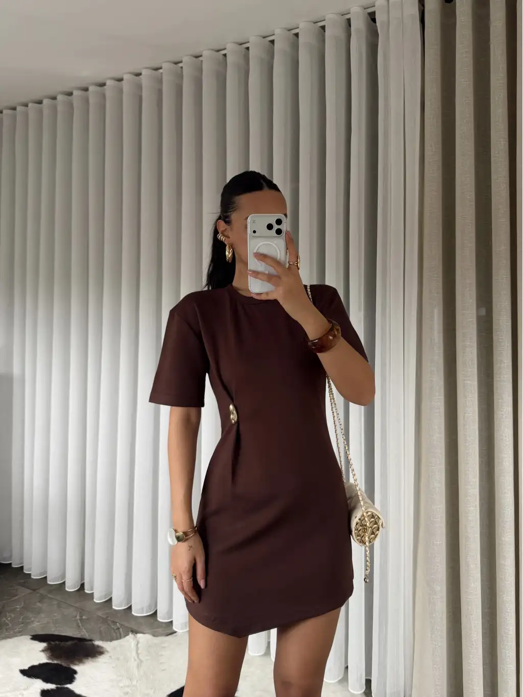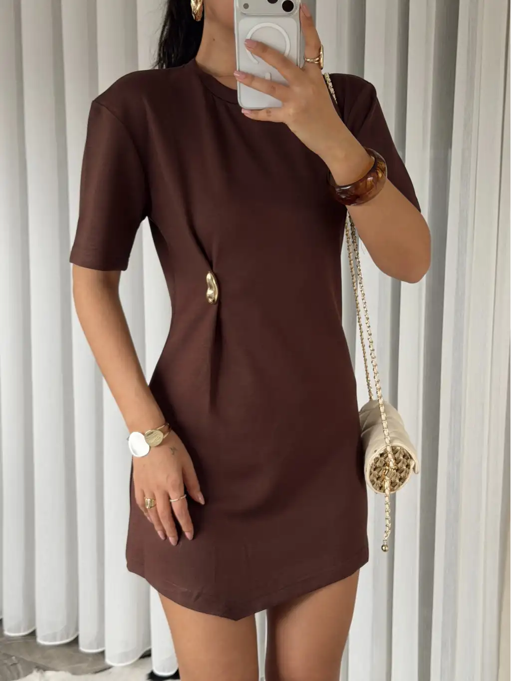 Gold tokalı modal kumaş mini elbise - Kahverengi