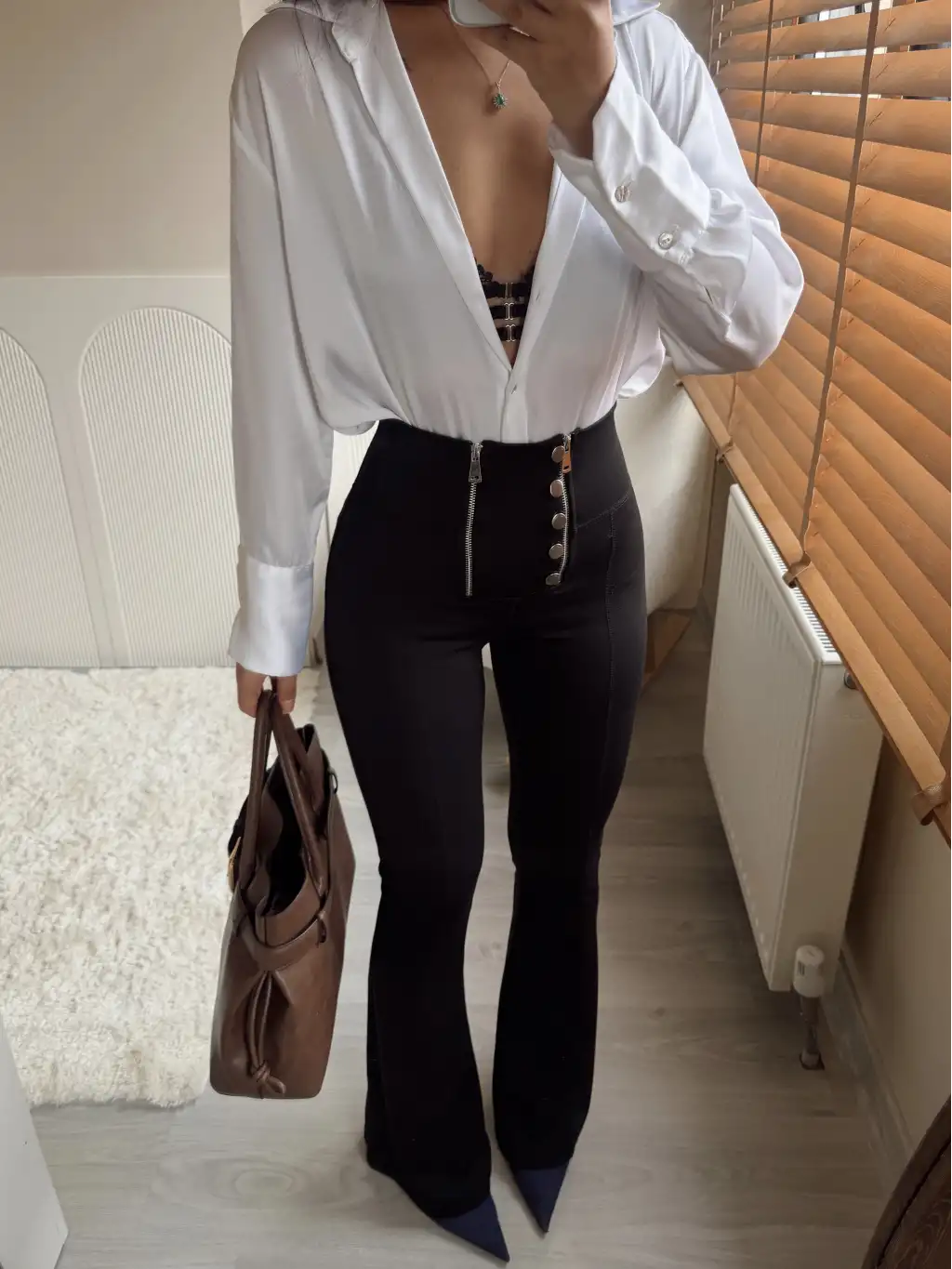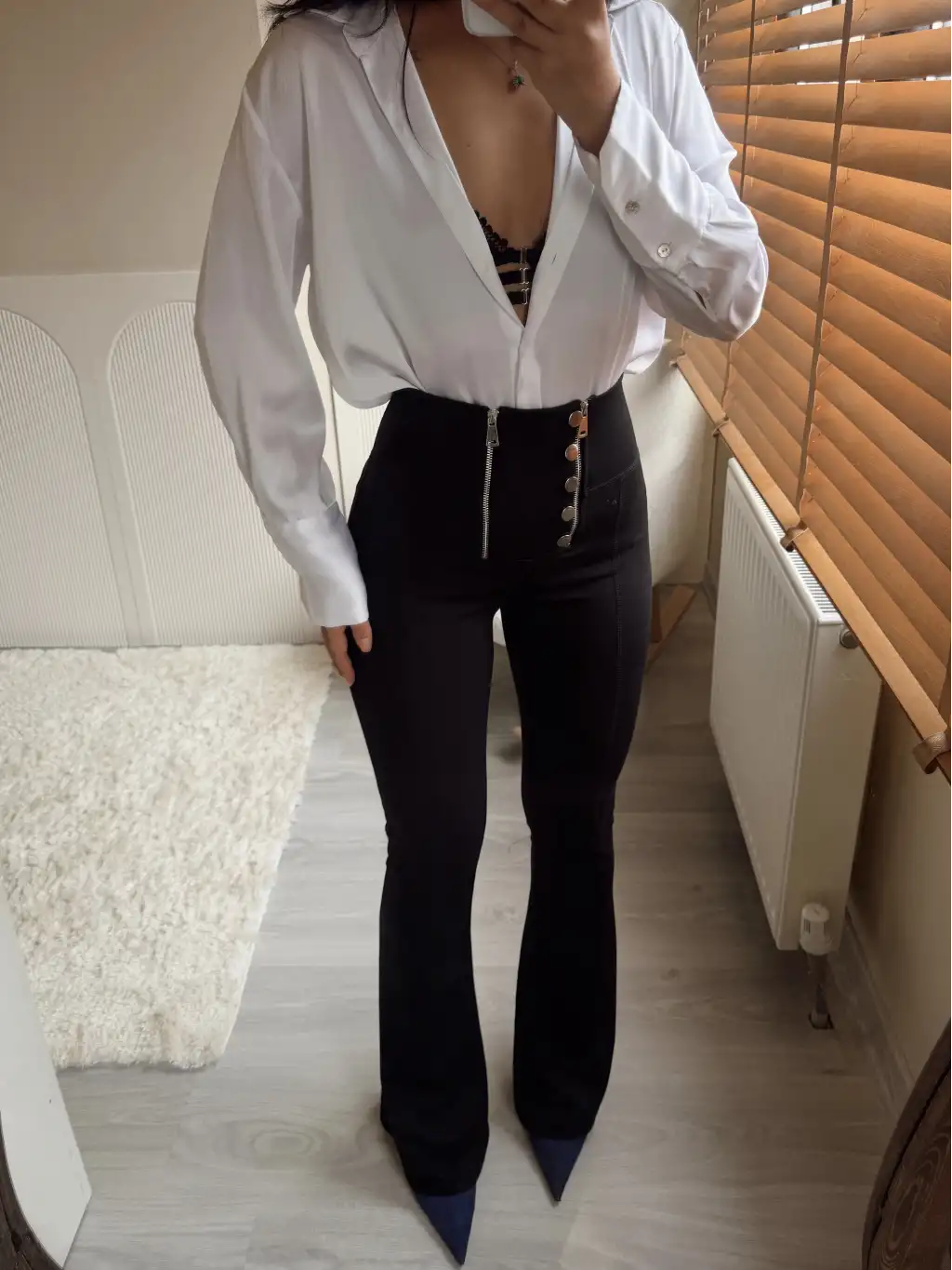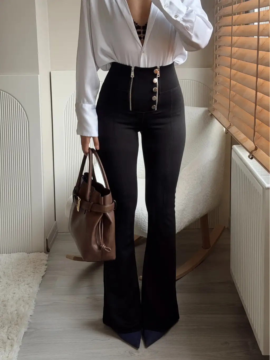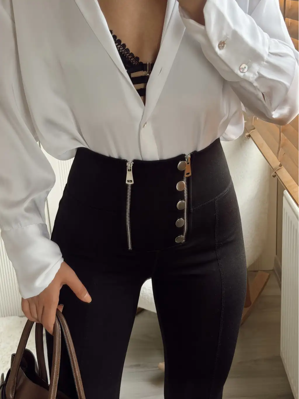 İspanyol paça düğme ve fermuar detay tayt pantolon- Siyah