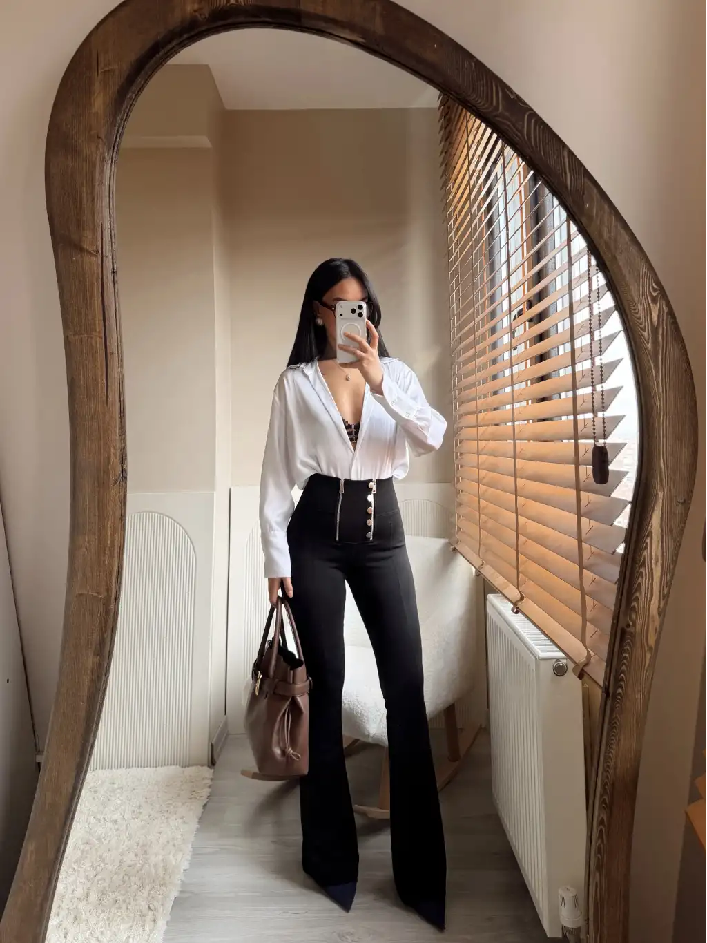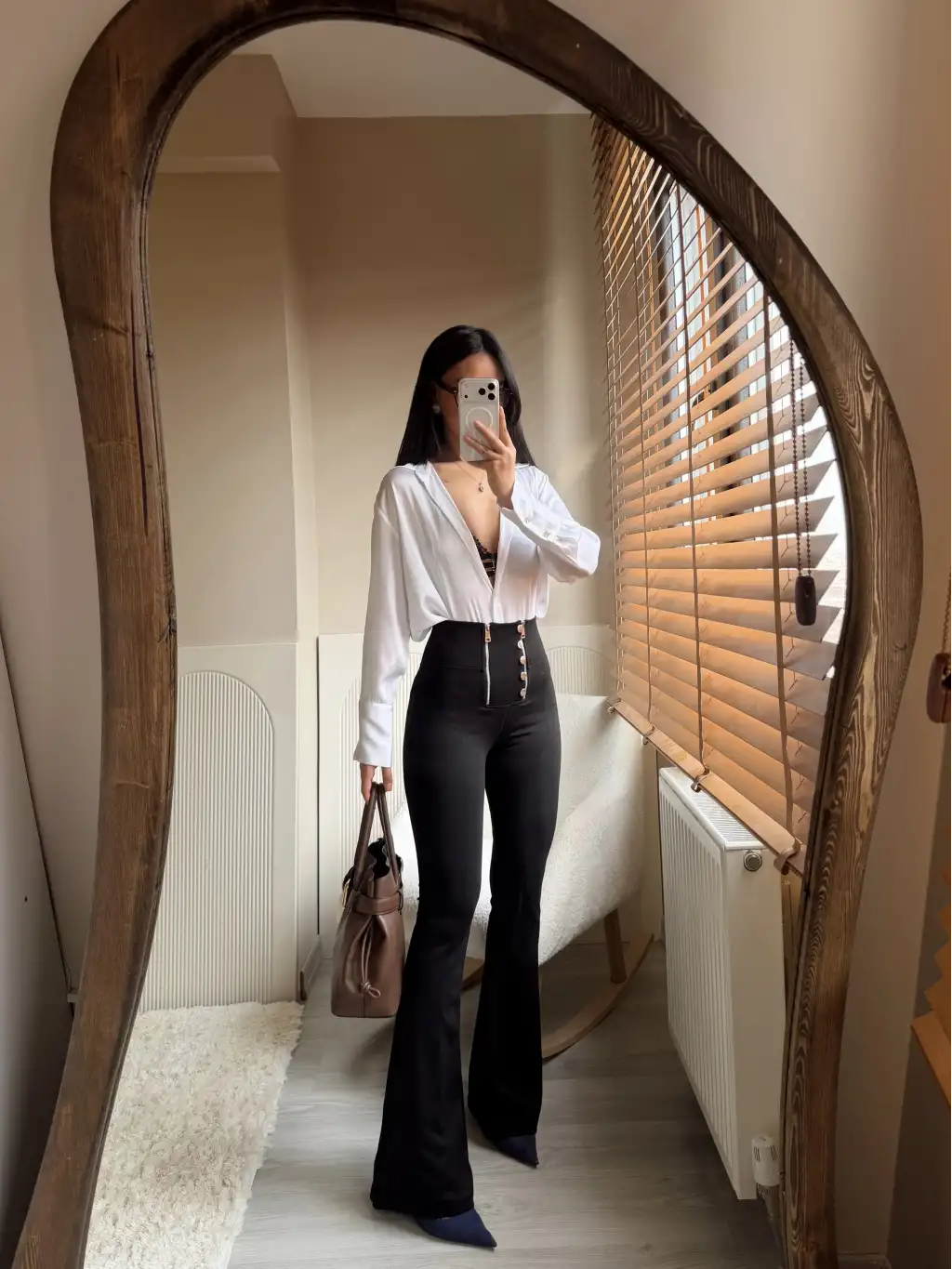 Belden oturan geniş kol bluz - Beyaz
