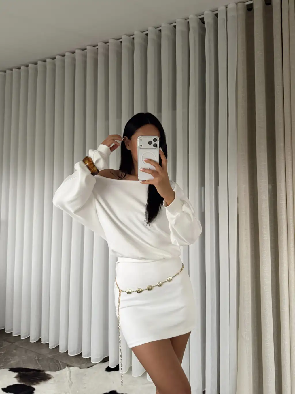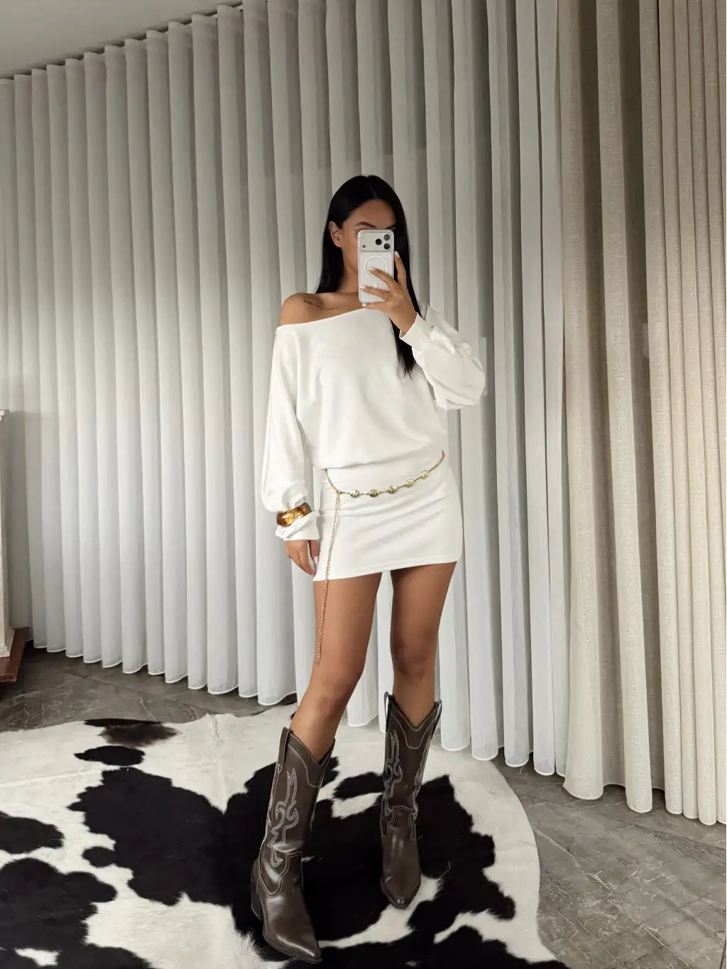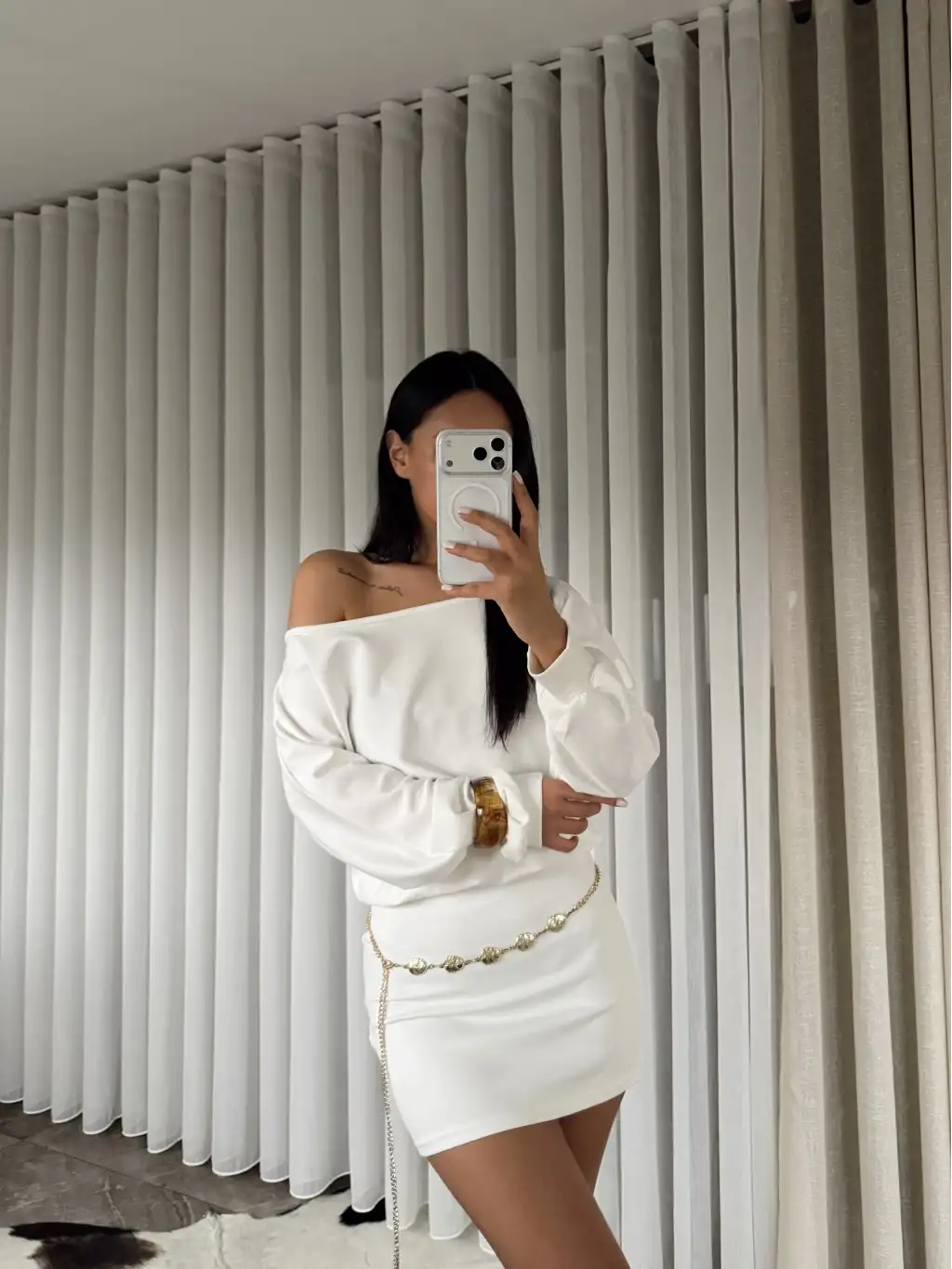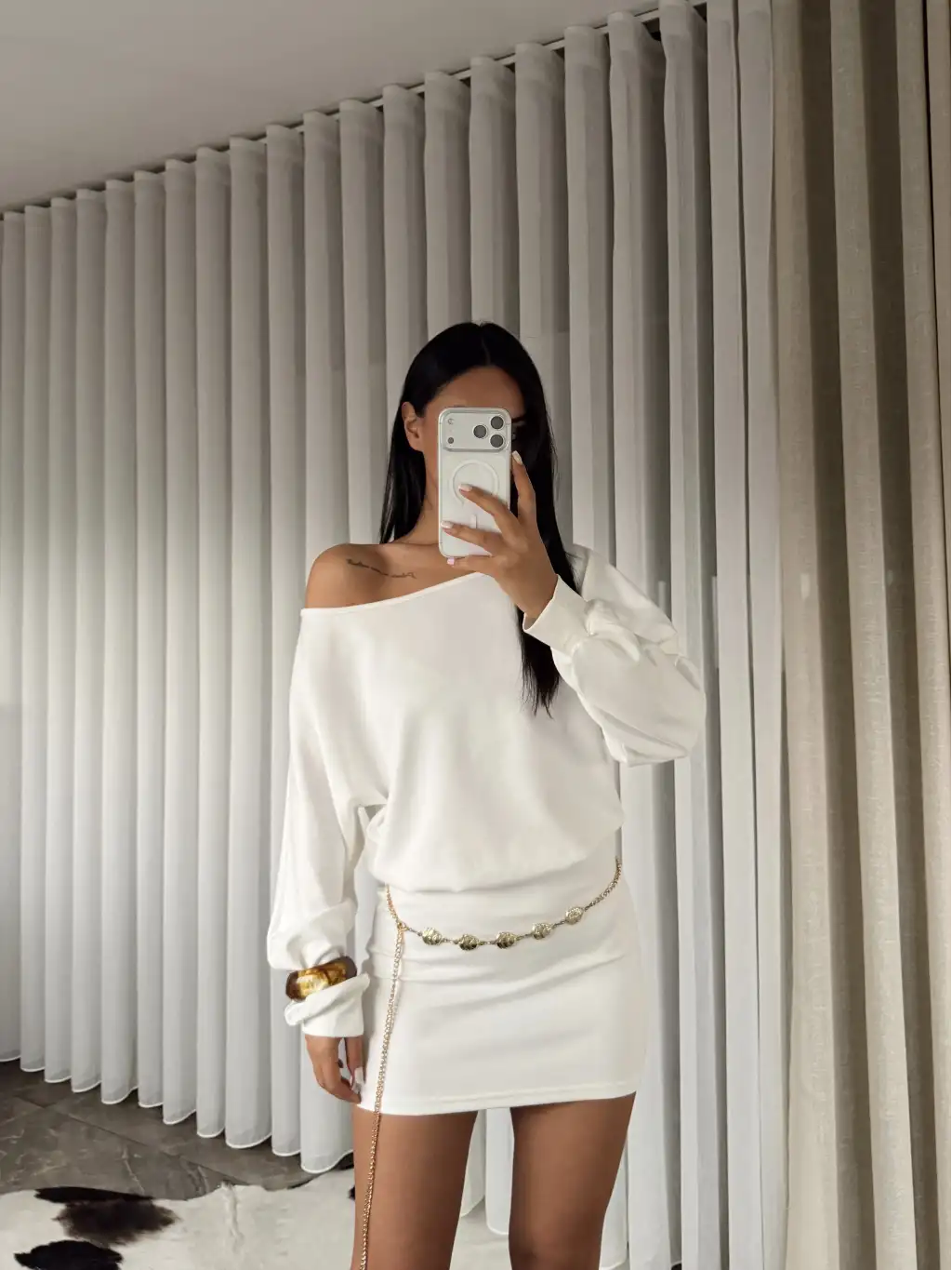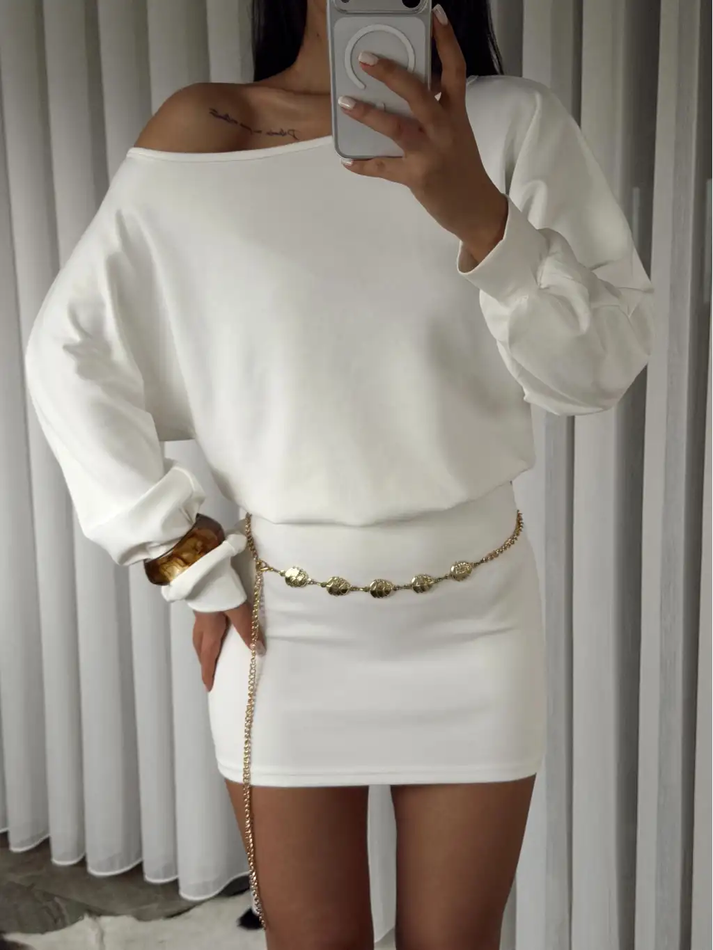 Modal kumaş kayık yaka mini elbise - Beyaz