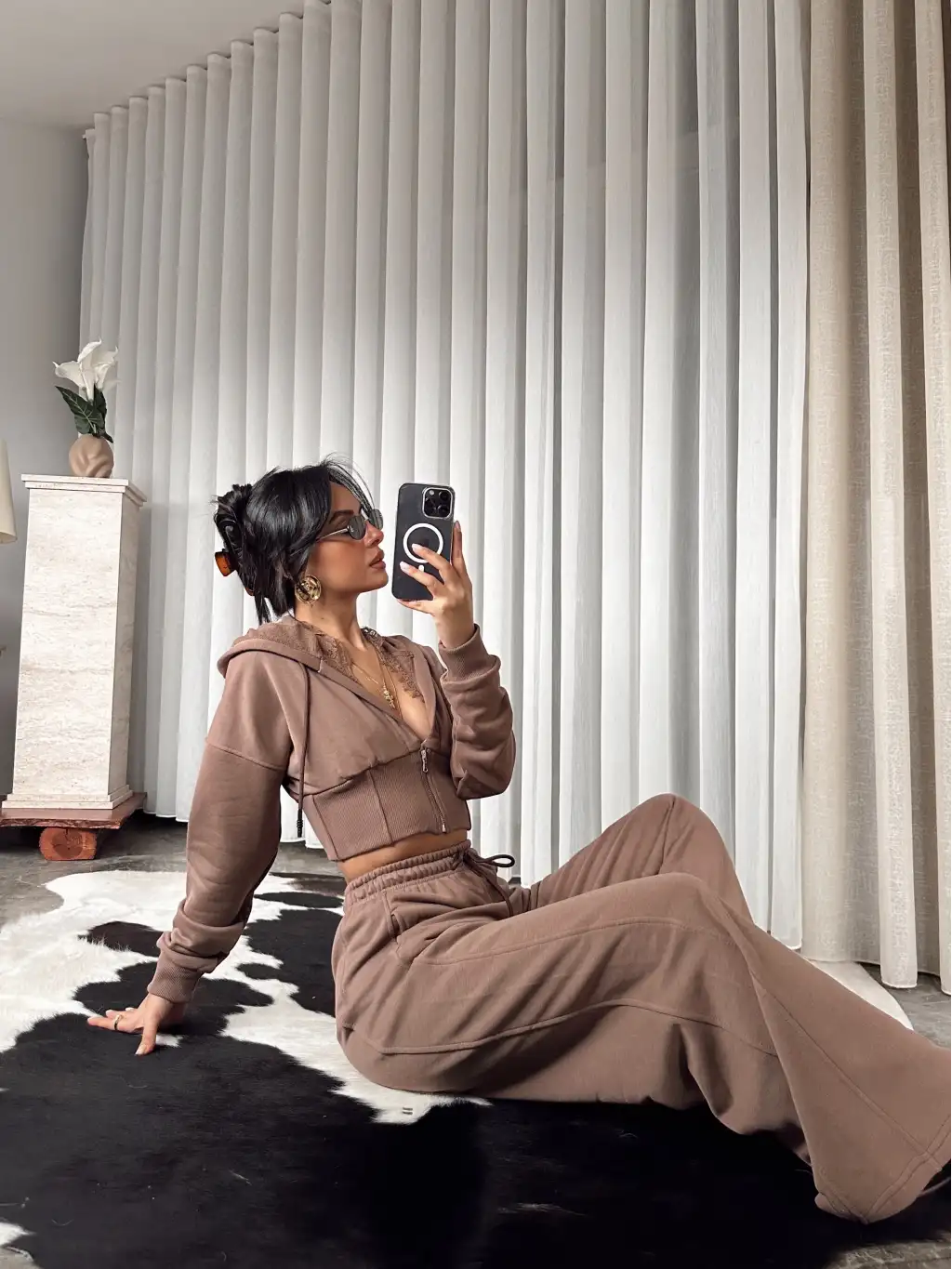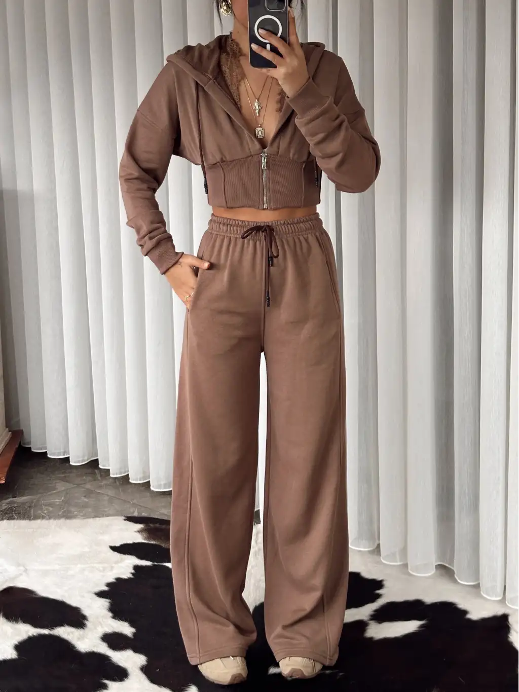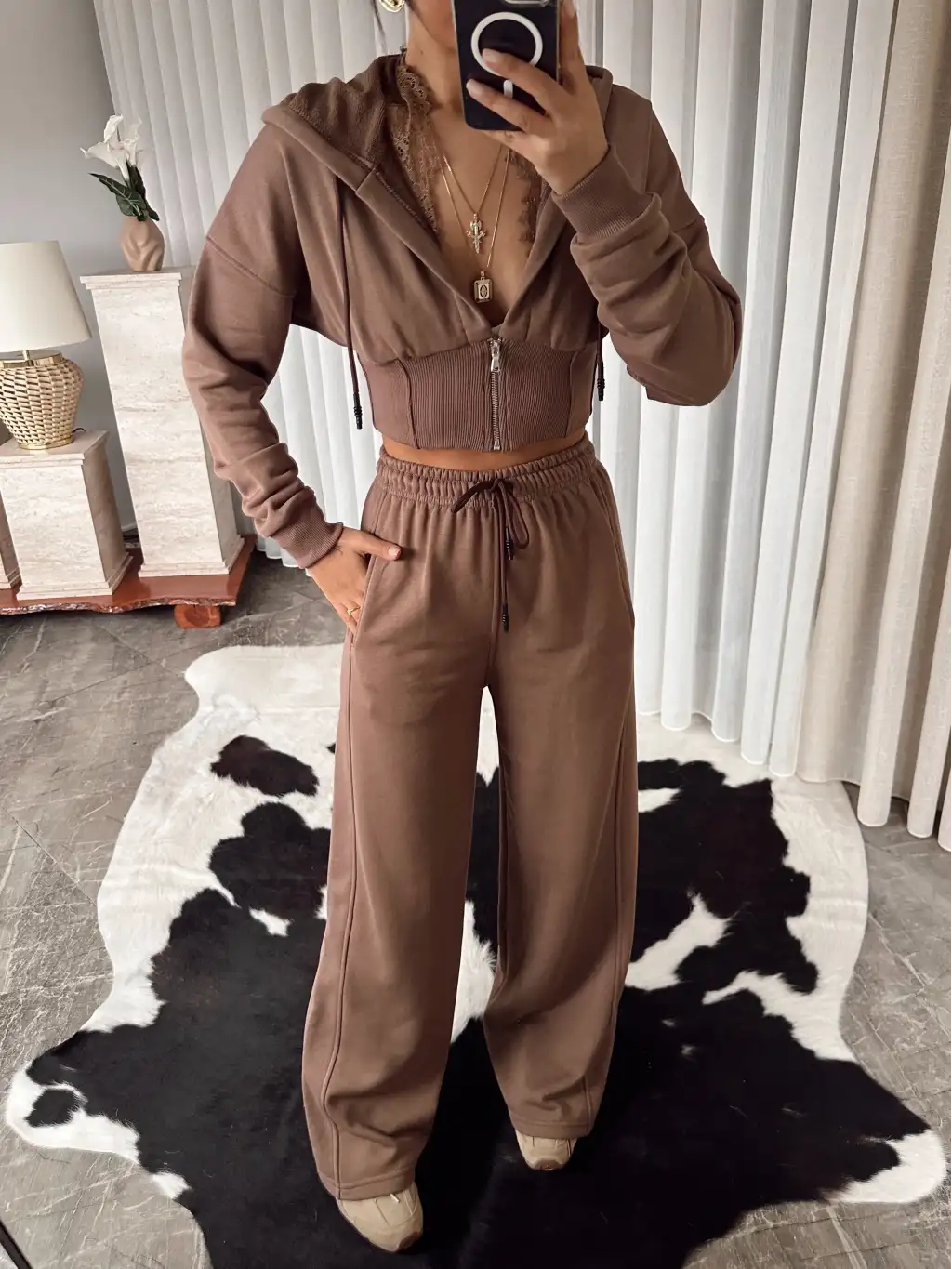Tasarım dantel detay eşofman takımı - Kahve