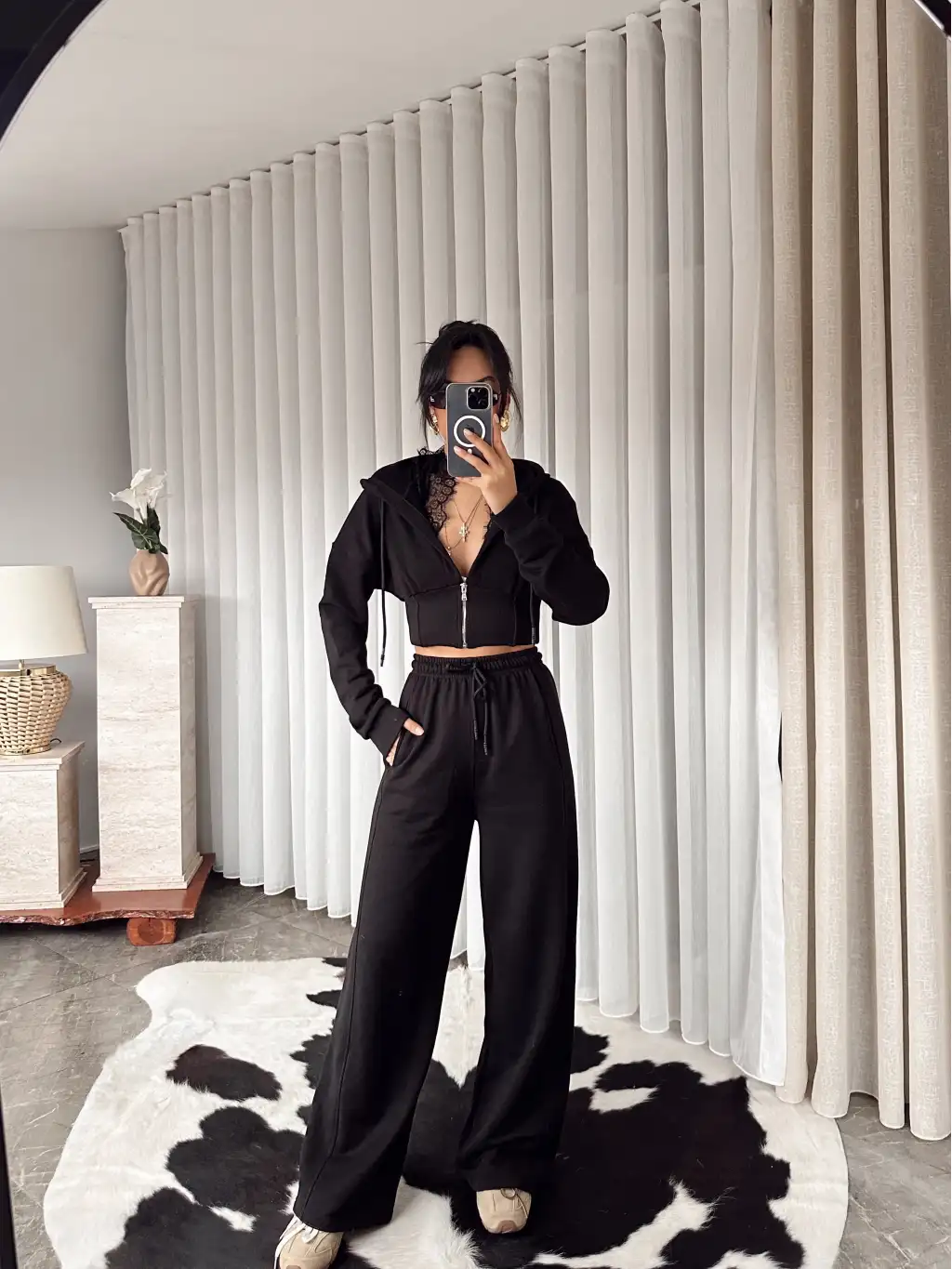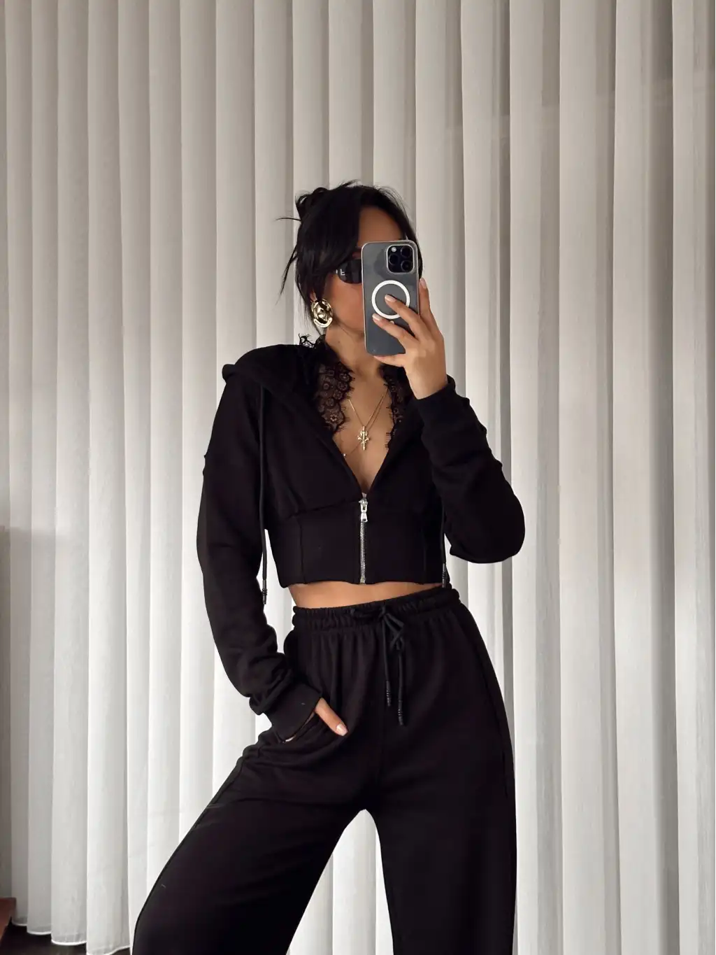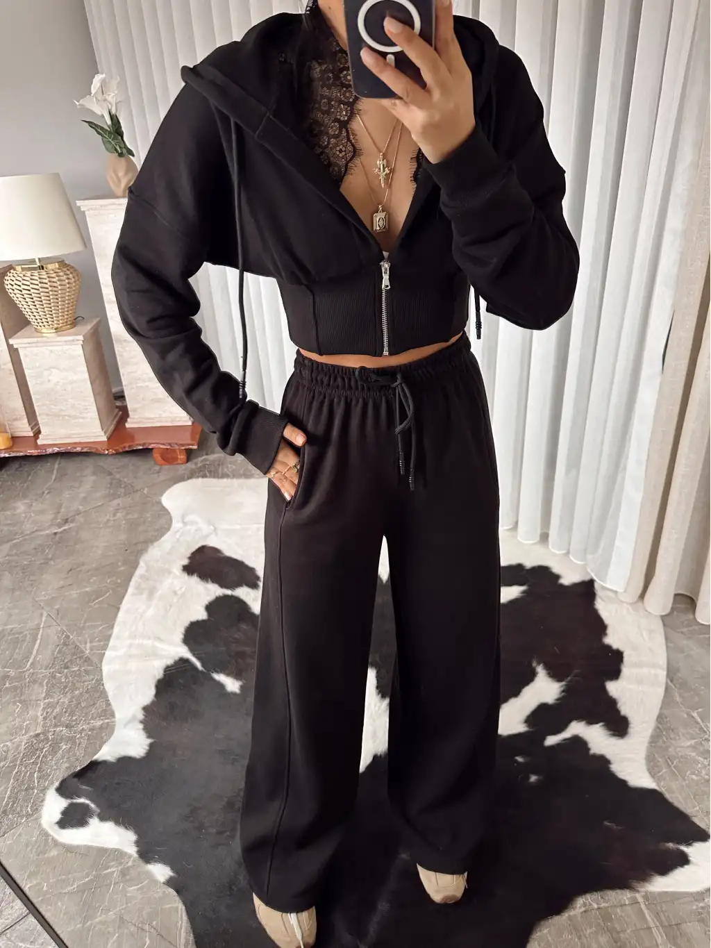 Tasarım dantel detay eşofman takımı - Siyah