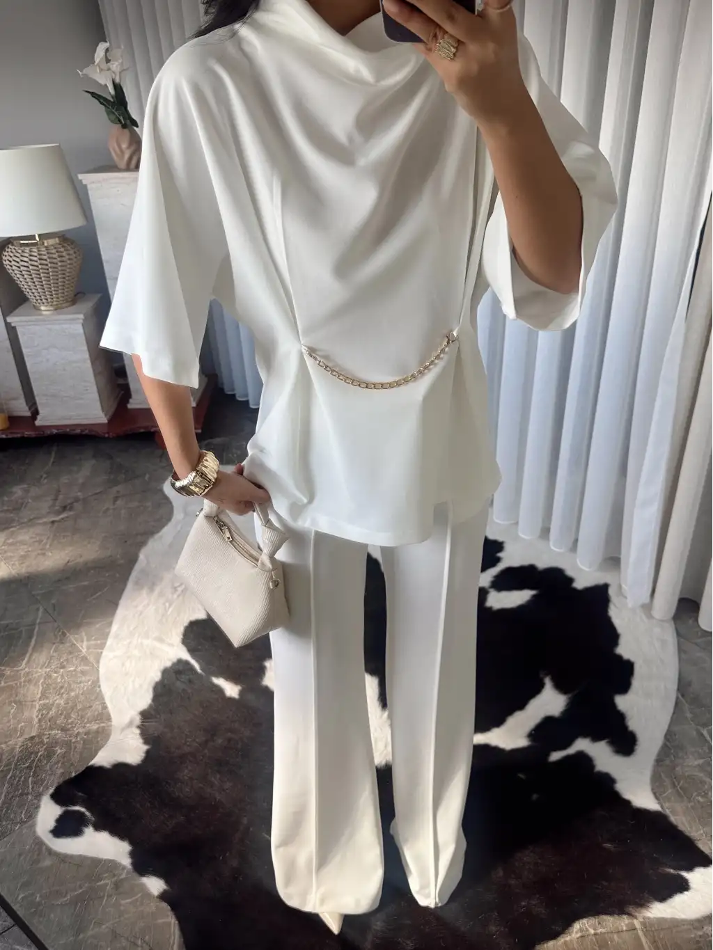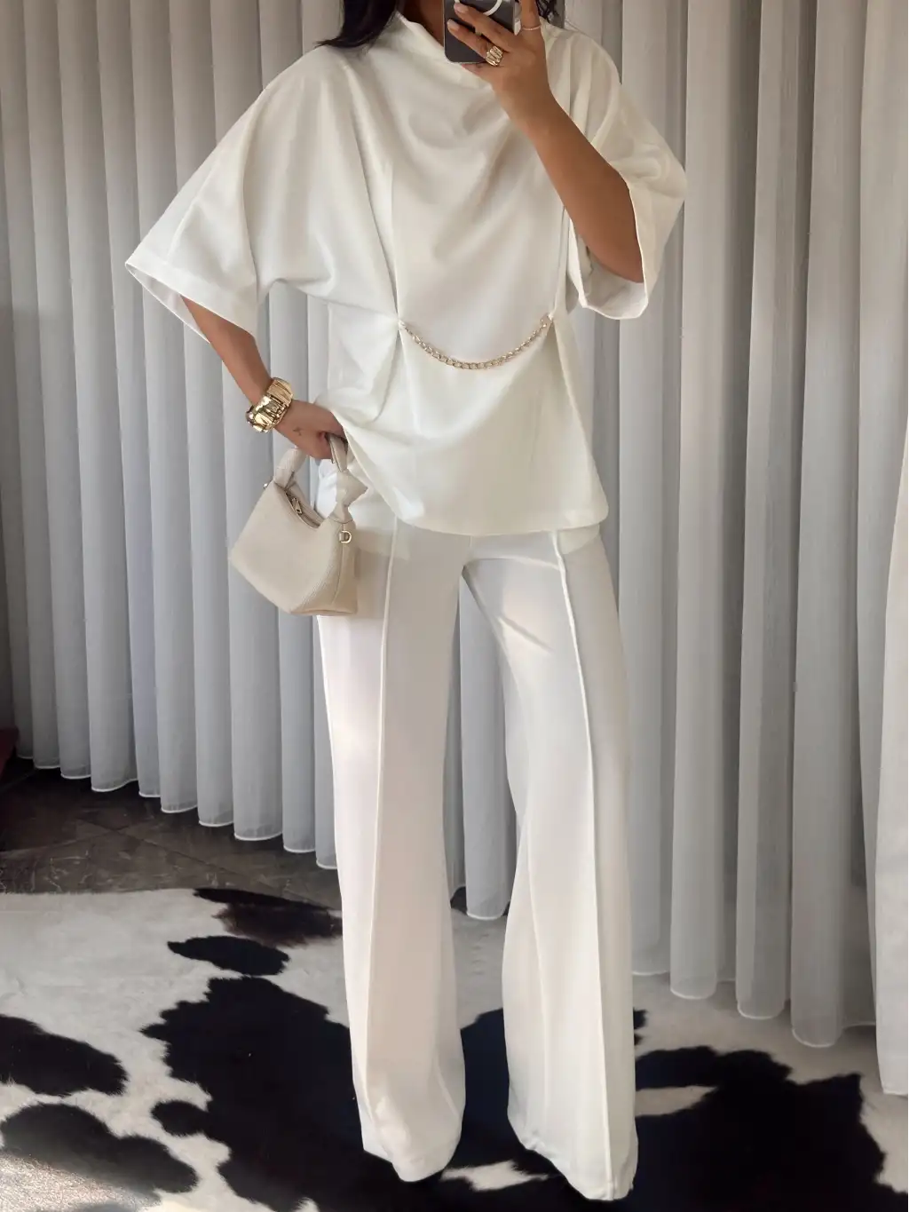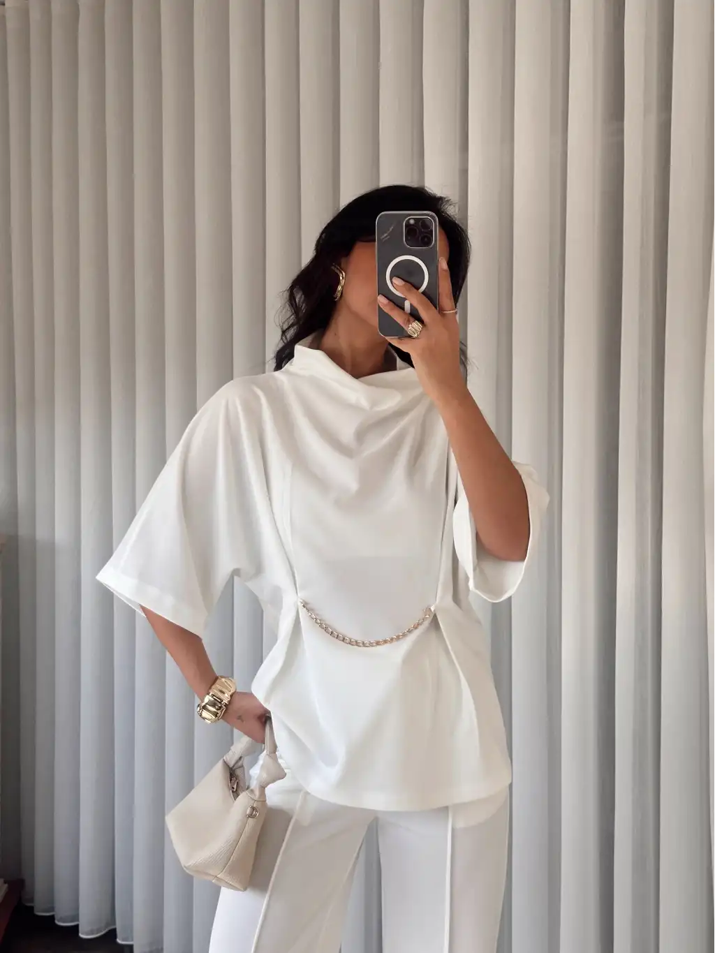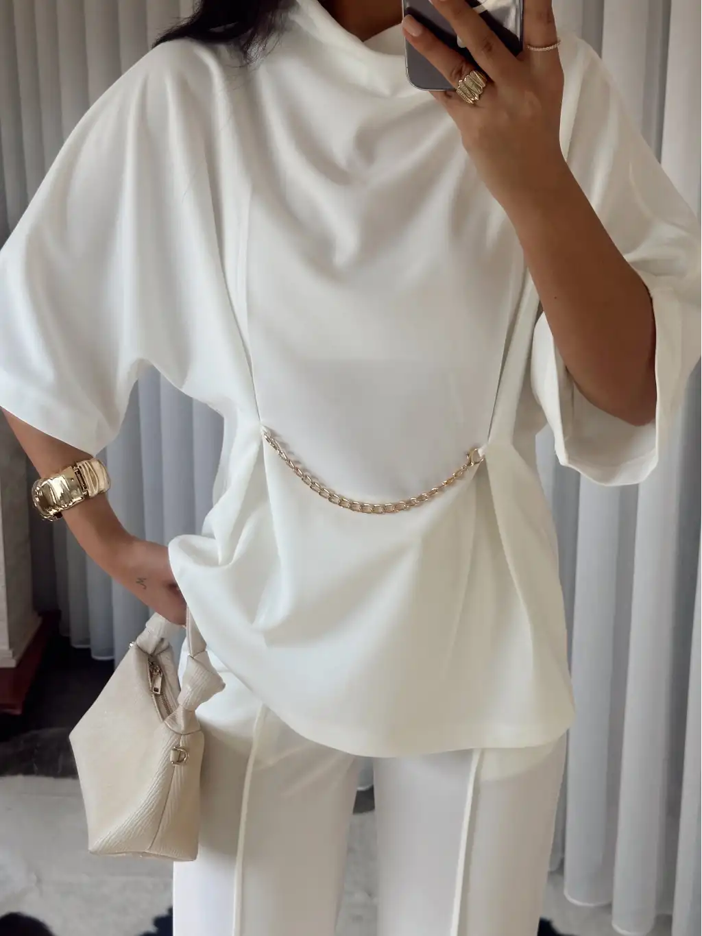 Tasarım pelerinli saten bluz - Beyaz